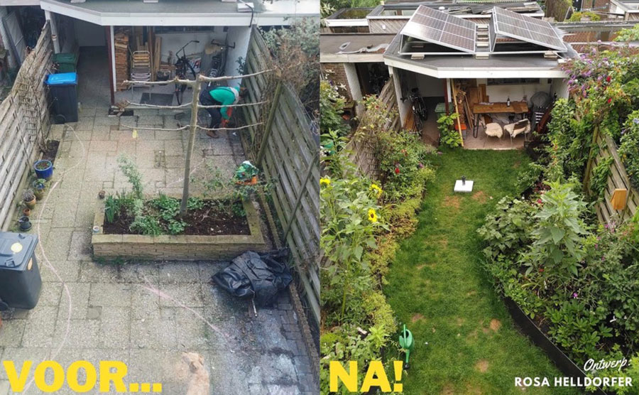 Dit ontwerp maakte ik voor een jong gezin in Arnhem. Ze kochten een huis dat een tandartsenpraktijk is geweest, een mat kunstgras was de ’tuin’.